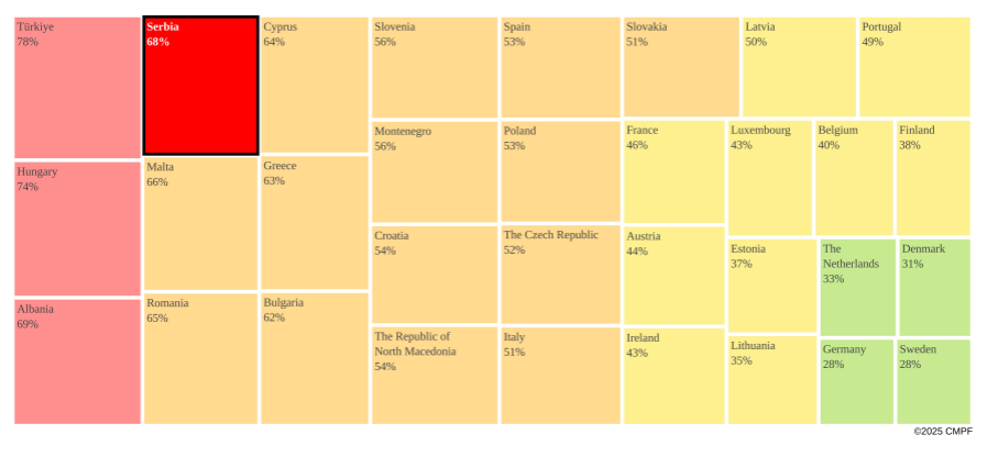 According to the latest available report, citizens of Serbia show a low level of trust in the media, with 65% of those who often and occasionally try to avoid the news. The main sources of information are television and online portals of traditional media, while more than half of citizens use social networks as a source of information. The Public Media Service (RTS) continues to be cited as the most trusted media outlet. Demographic factors predominantly determine citizens’ orientation towards the type and variety of news sources – 54% of the population over 65 exclusively use traditional media. A state-owned Telekom Srbija company is a dominant player in telecommunications but also in the media market, creating unfair competition in the internal media market and the advertising market. Thanks to a special law provision from 2023 that directly governs companies that perform electronic communications activities to establish media outlets, the Telekom company has been enabled to purchase and establish media. This way, the concentration of the media market under the state-party control is growing, seeming to lead to the establishment of a new state-party media conglomerate in Serbia.