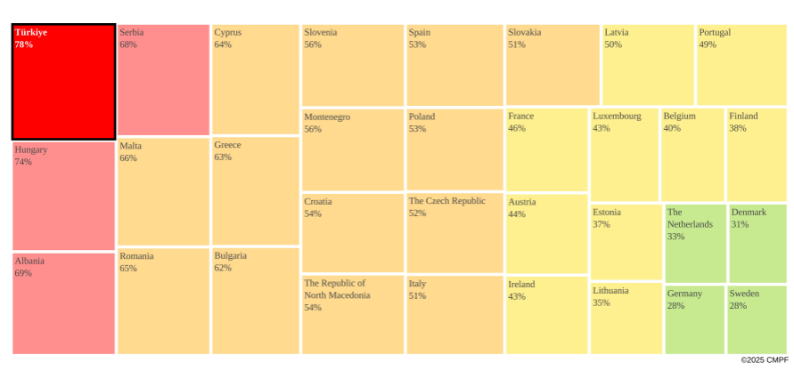In 2024, Türkiye continued its democratic decline through restrictive legal and regulatory frameworks, with heightened pressure on the opposition and media. Amendments to Law No. 5651 and Law No. 7418, alongside Article 217 of the Turkish Penal Code, were used to criminalize disinformation, resulting in 4,590 investigations—56 of them targeting media professionals; 33 individuals were arrested (Tekin, 2024). The European Commission’s Türkiye Report (2024) emphasized the weakening of parliamentary oversight and rising pressure on opposition mayors. The arrest of Istanbul Mayor Ekrem İmamoğlu, a key opposition figure, on corruption charges during the reporting period led to major public protests (Euronews, 2025). Censorship and self-censorship remained widespread. RTÜK imposed ₺223.2 million (approx. €6.2 million) in fines, mainly targeting critical outlets such as NOW, Tele 1, Halk TV, Sözcü TV, and Flash Haber (Anka Haber, 2024). These sanctions, combined with media market concentration and political appointments at TRT and RTÜK, significantly harmed media pluralism and viability. Türkiye ranked 158th out of 180 countries in the RSF 2024 World Press Freedom Index (RSF, 2024). Economically, despite 3.2% growth and a return to orthodox policies in the second half of the year (TÜİK, 2025), inflation remained high. Official inflation reached 44.38%, while ENAG (2024) reported 83.4%. The poverty rate rose by 46.6% (Türk-İş, 2024). The minimum wage (₺17,002/month) fell far short of the poverty threshold for a family of four (₺66,976/month).