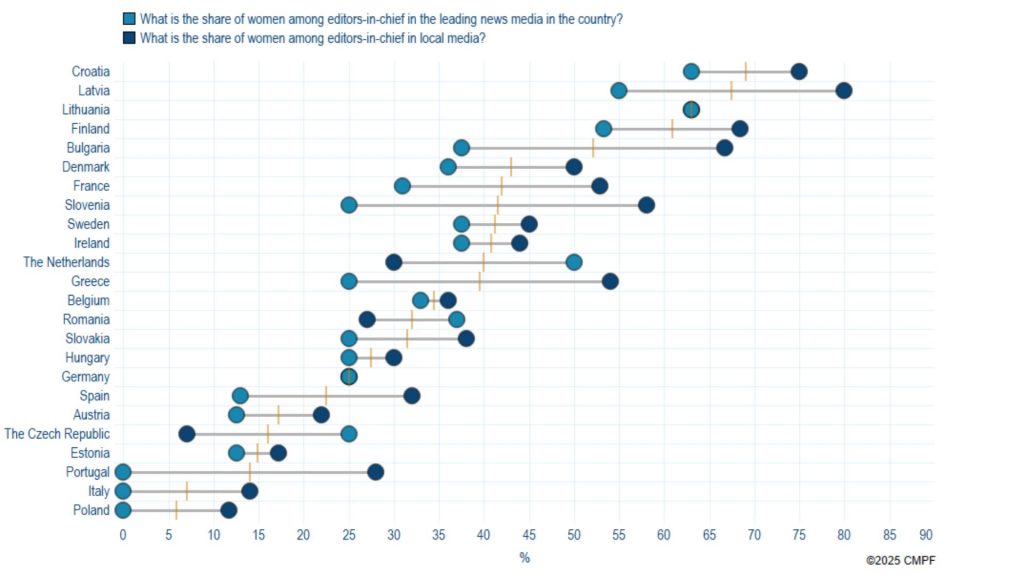 In countries where gender parity in terms of editors-in-chief both at the national and local level is achieved, this does not automatically guarantee quantitative nor qualitative gender balance in news media content. For example, while Lithuania has reached parity in terms of editors-in-chief both at the national and at the local level, women experts tend to remain underrepresented in Lithuanian media, where the figure stands at 30,3% (Jastramskis, 2025). This echoes the situation in Latvia, with existing research showing that women make-up only one-third of experts participating in discussion programmes (Rožukalne & Sprudzāne, 2024 cited in Rožukalne & Skulte, 2025).